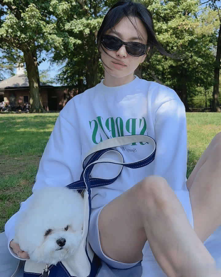 卫衣的颜色以白色为主,为了让整体造型更搭,腿上的短裤亦是白色。